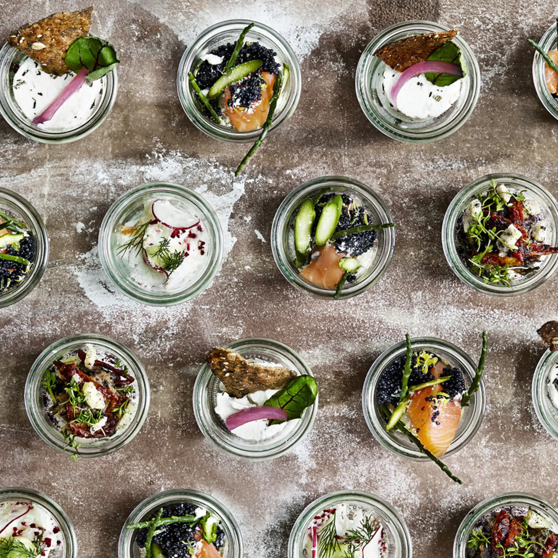Small, decorative appetizers for light bites, served as finger food for receptions, festive occasions or as part of a larger menu.