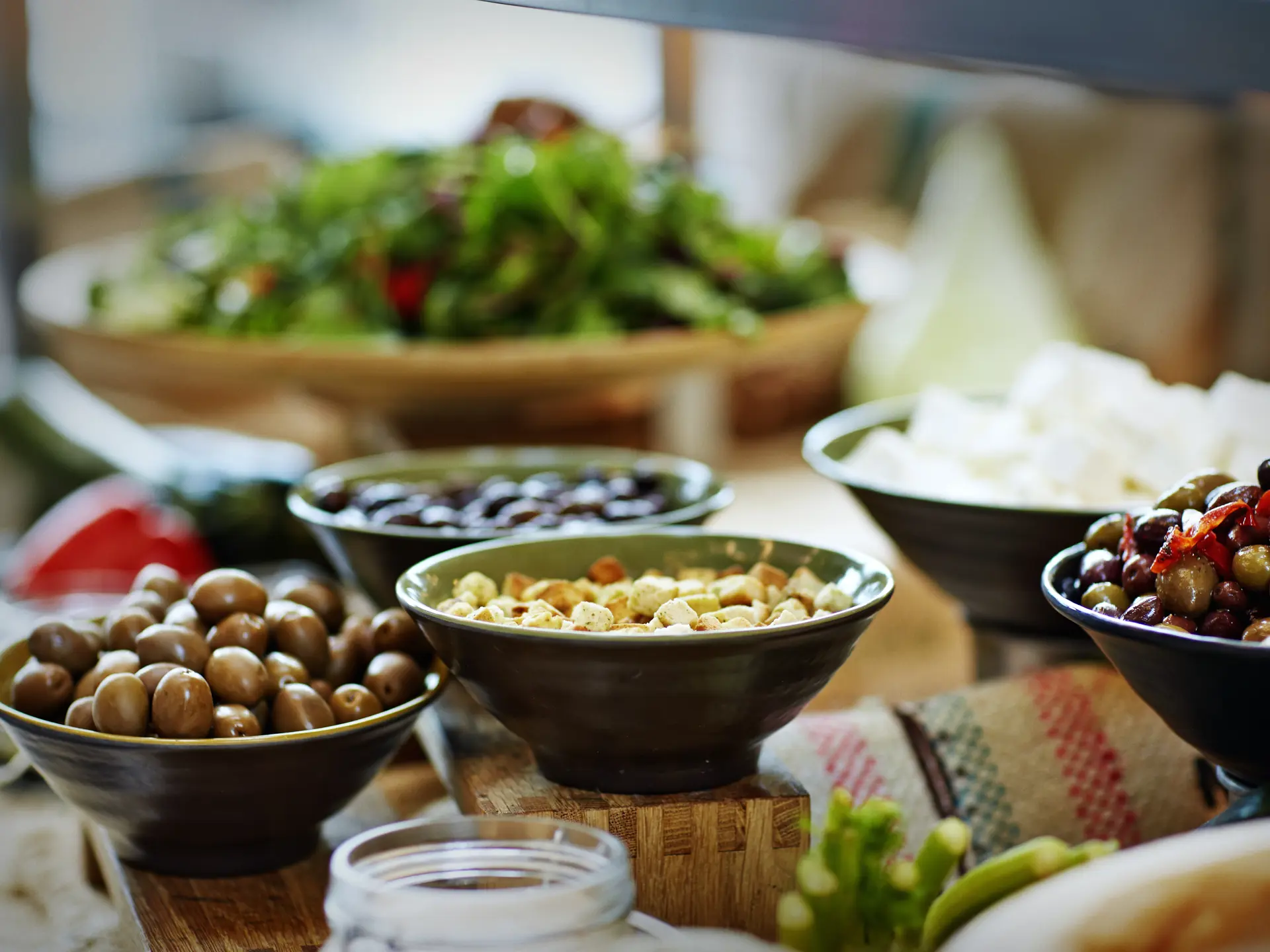 Skiver af feta, grillede oliven, tomat, agurk, spæde salater, rødløg og tzatziki, toppet med oregano, olivenolie og citron